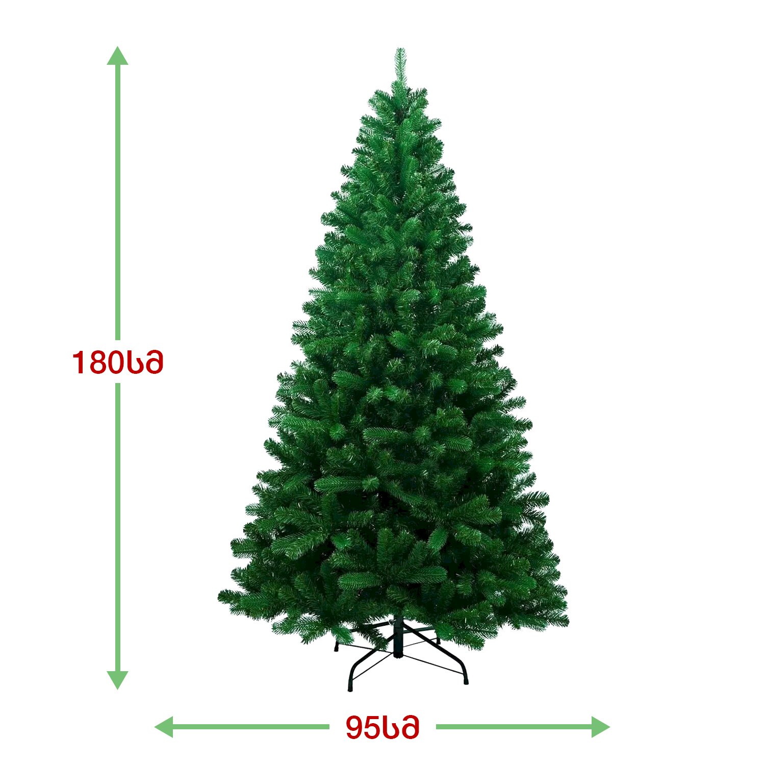 სადა მწვანე ნაძვის ხე გამძლე დრეკადი მეტალის ტოტებით და ჯანმრთელობისთვის უსაფრთხო მასალისგან დამზადებული წიწვებით. მეტალის მყარი სადგამით და მთავარი ღერძით.