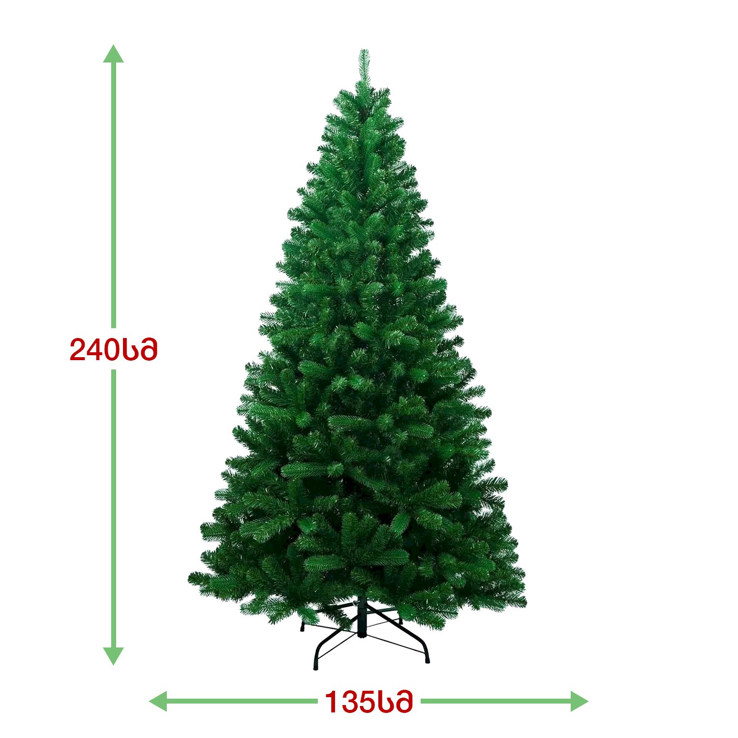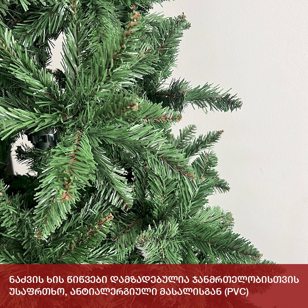 სადა მწვანე ნაძვის ხე გამძლე დრეკადი მეტალის ტოტებით და ჯანმრთელობისთვის უსაფრთხო მასალისგან დამზადებული წიწვებით. მეტალის მყარი სადგამით და მთავარი ღერძით.