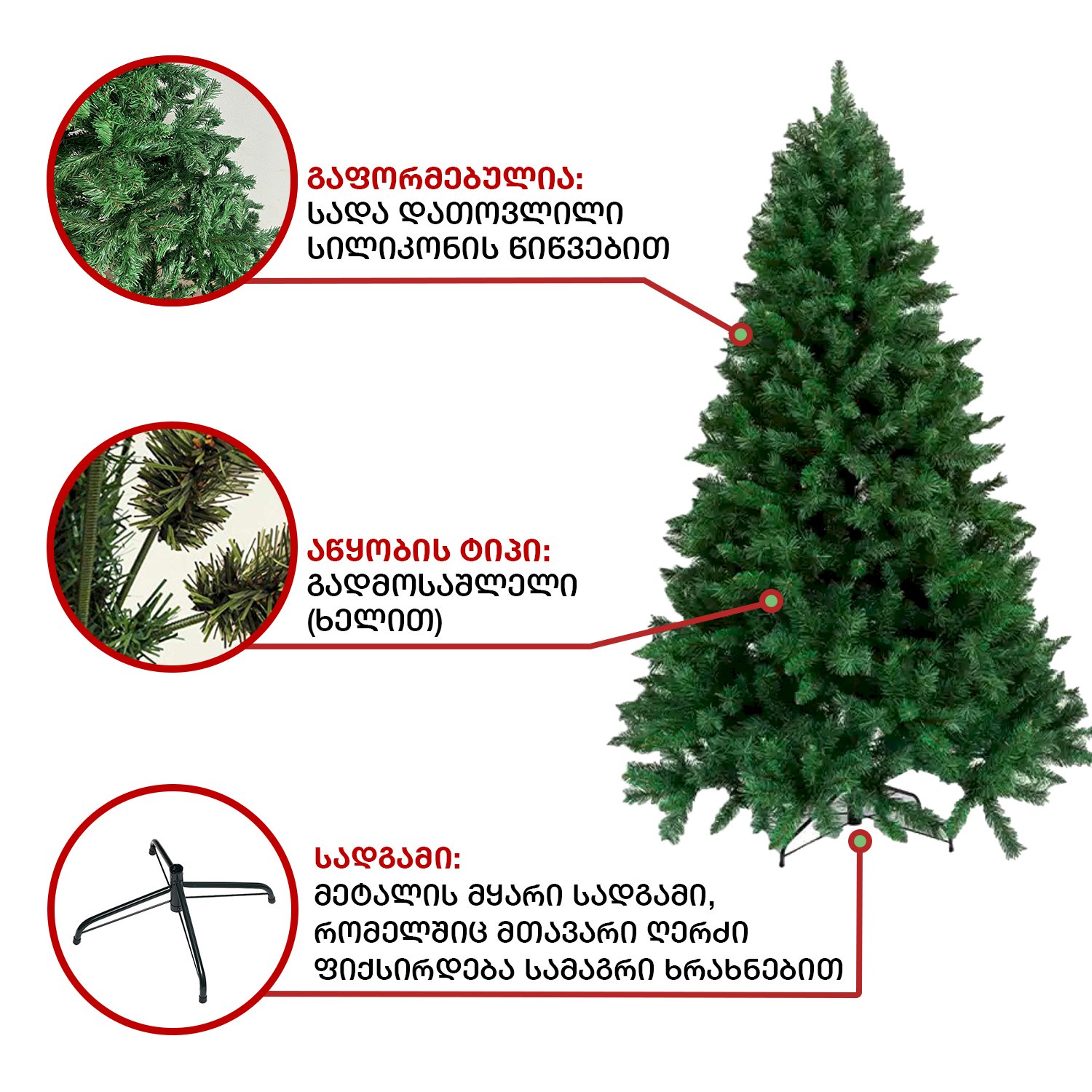 სადა მწვანე ნაძვის ხე გამძლე დრეკადი მეტალის ტოტებით და ჯანმრთელობისთვის უსაფრთხო მასალისგან დამზადებული წიწვებით. მეტალის მყარი სადგამით და მთავარი ღერძით.