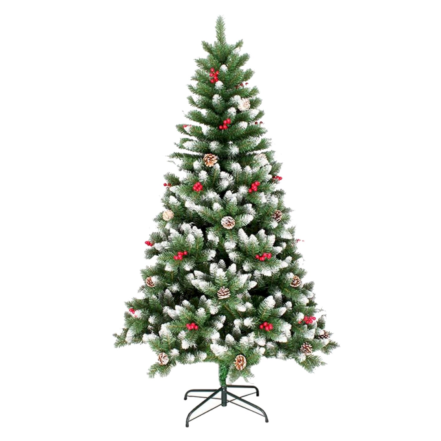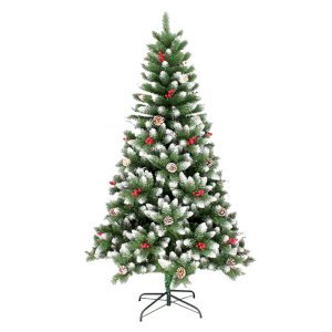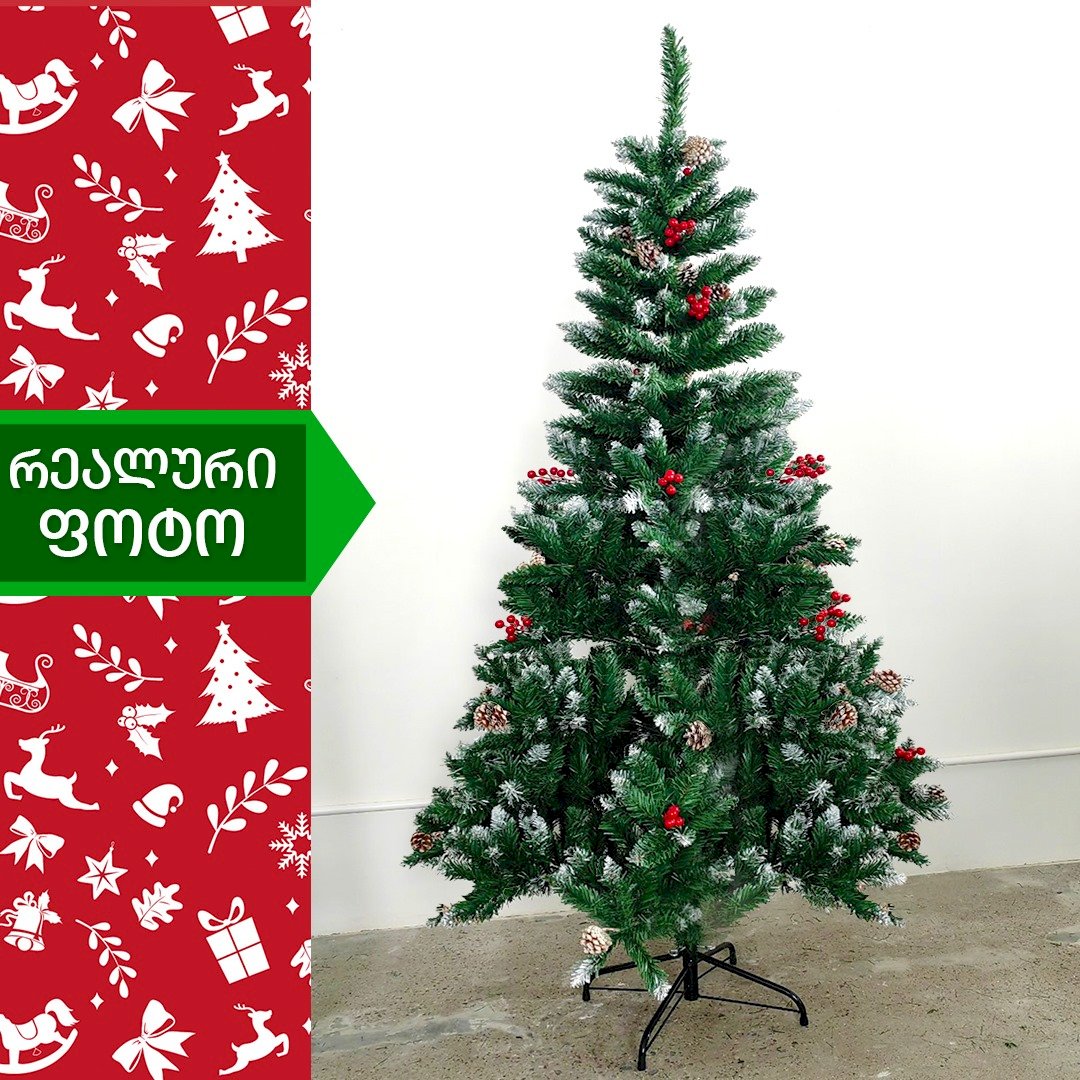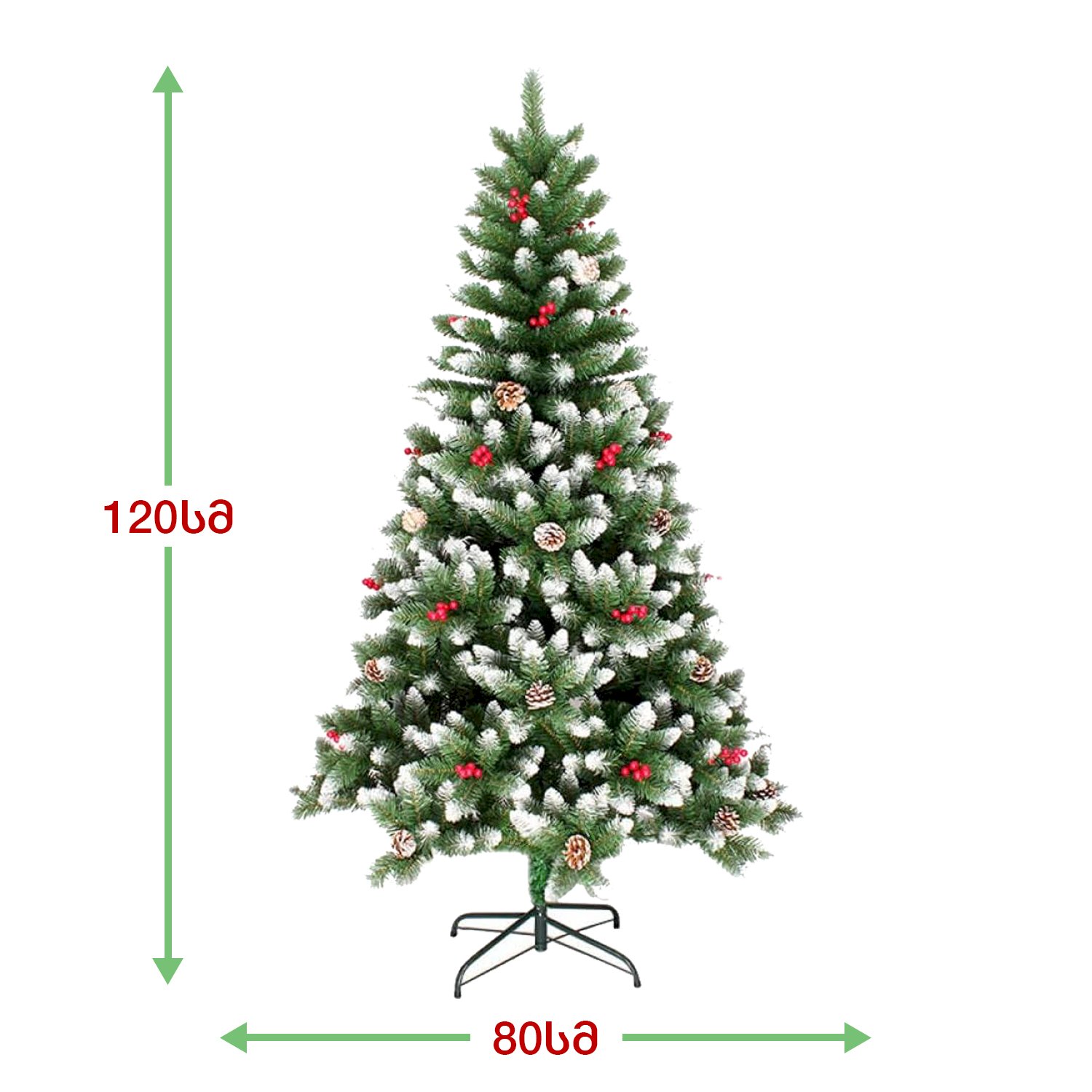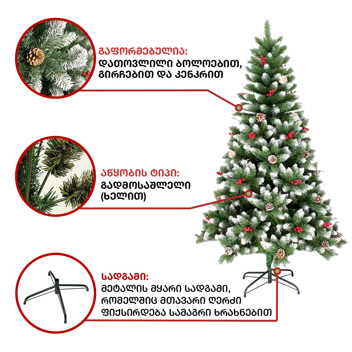 ნაძვის ხე დათოვლილი ბოლოებით, გაფორმებული გირჩებით და კენკრით. გამძლე დრეკადი მეტალის ტოტებით და ჯანმრთელობისთვის უსაფრთხო მასალისგან დამზადებული წიწვებით. მეტალის მყარი სადგამით და მთავარი ღერძით.