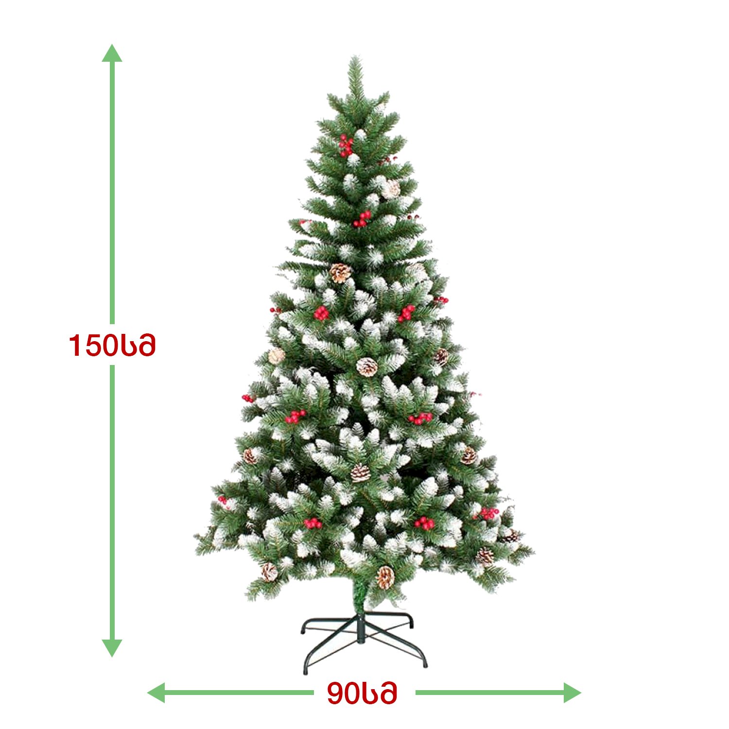ნაძვის ხე დათოვლილი ბოლოებით, გაფორმებული გირჩებით და კენკრით. გამძლე დრეკადი მეტალის ტოტებით და ჯანმრთელობისთვის უსაფრთხო მასალისგან დამზადებული წიწვებით. მეტალის მყარი სადგამით და მთავარი ღერძით.