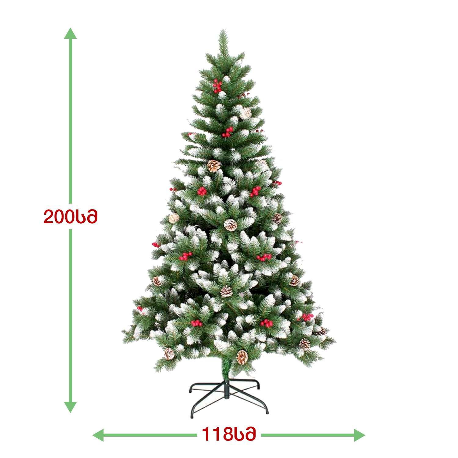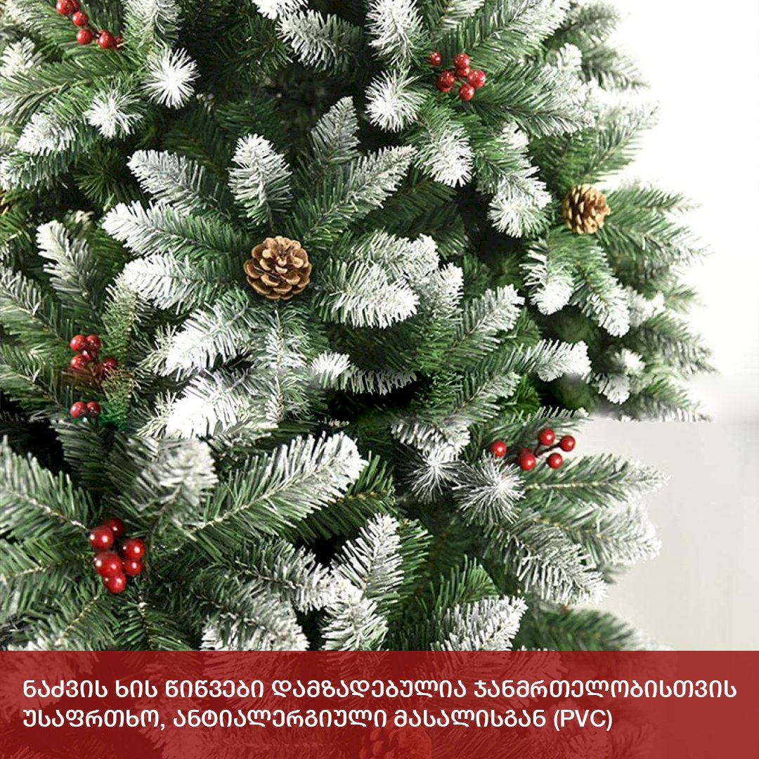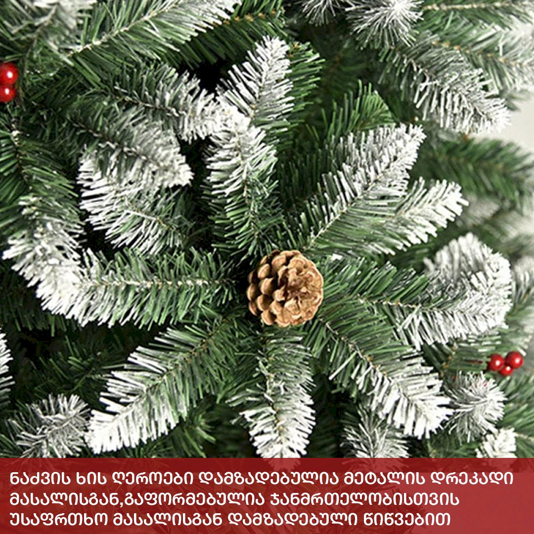 ნაძვის ხე დათოვლილი ბოლოებით, გაფორმებული გირჩებით და კენკრით. გამძლე დრეკადი მეტალის ტოტებით და ჯანმრთელობისთვის უსაფრთხო მასალისგან დამზადებული წიწვებით. მეტალის მყარი სადგამით და მთავარი ღერძით.