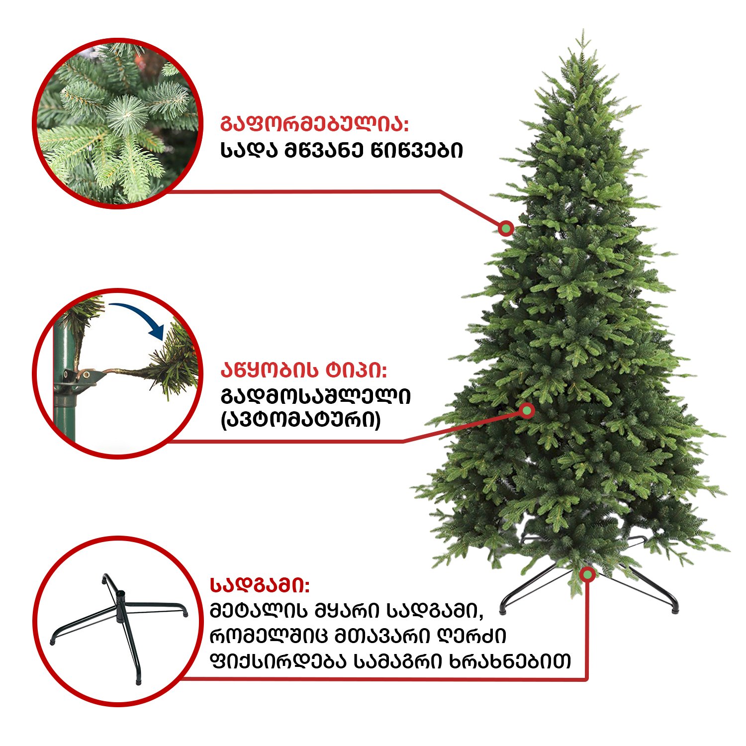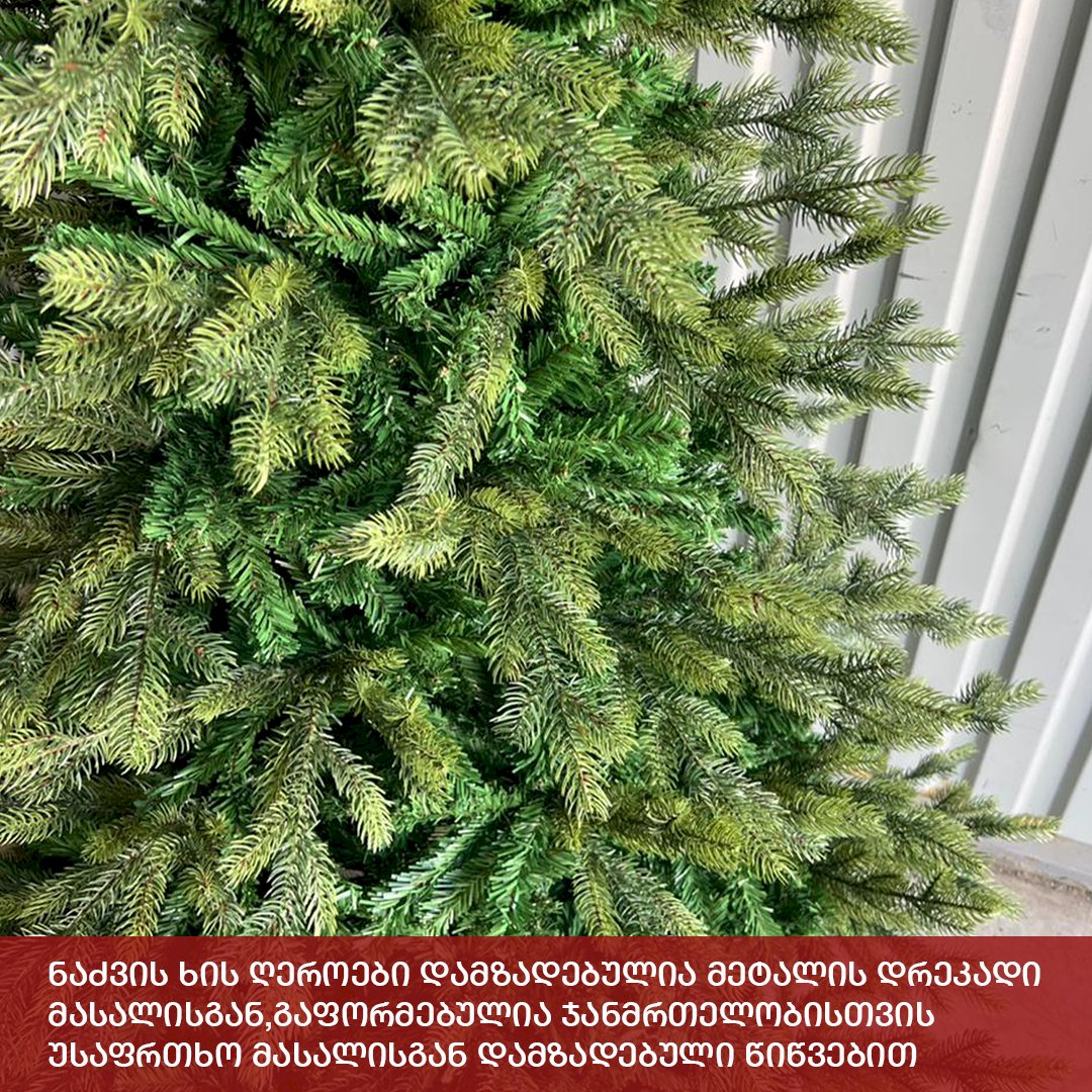 ბუნებრივის მსგავსი ნაძვის ხე,  დრეკადი მეტალის ტოტებით და ჯანმრთელობისთვის უსაფრთხო მასალისგან დამზადებული შერეული ორი ფერის, სილიკონის და PVC წიწვით . მეტალის მყარი სადგამით და მთავარი ღერძით.